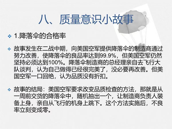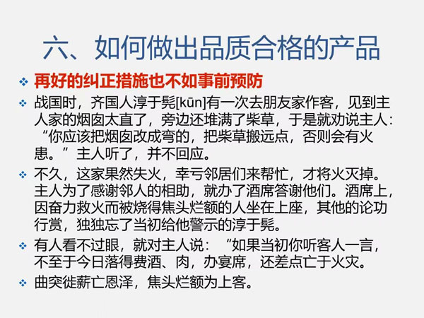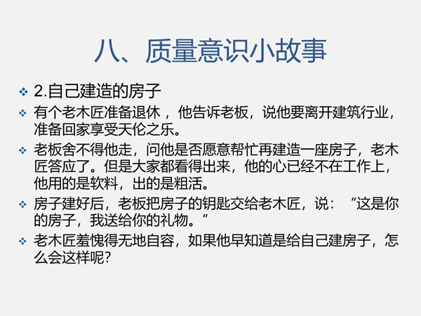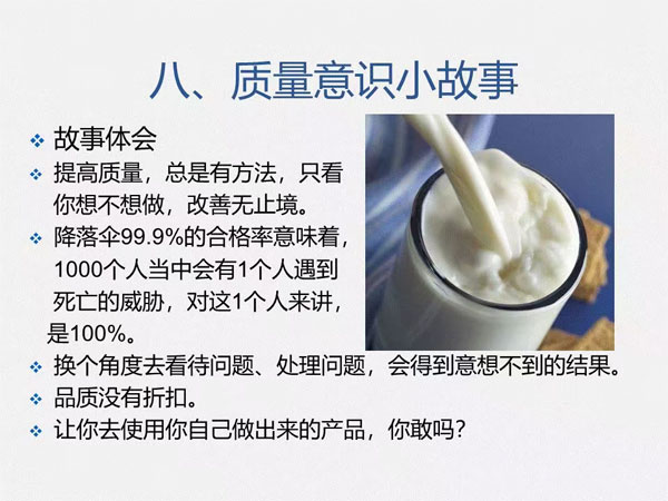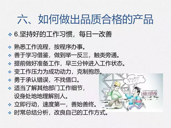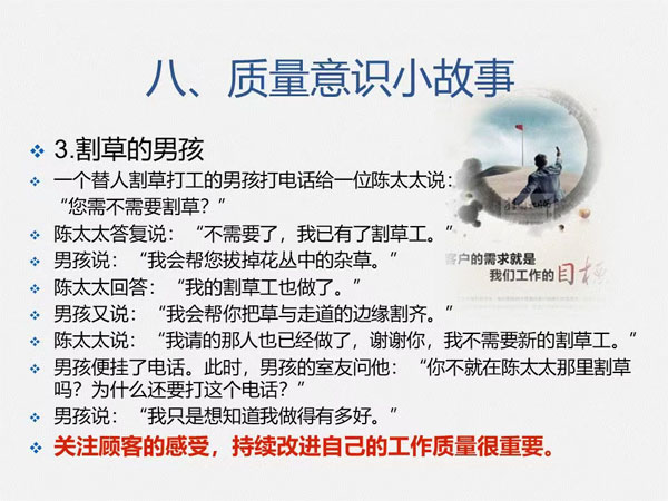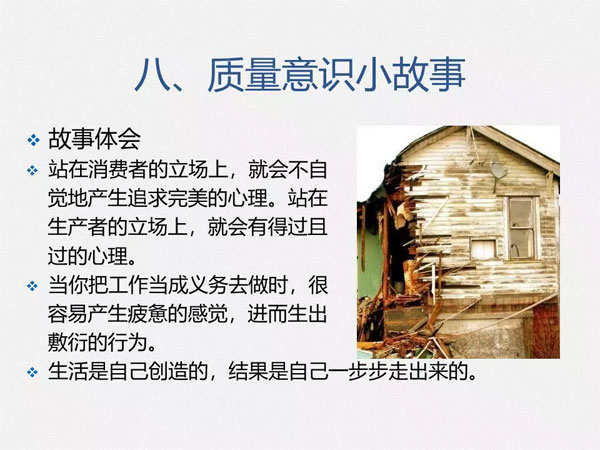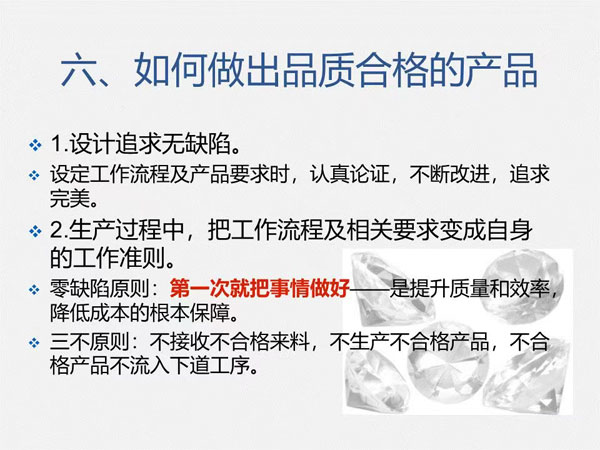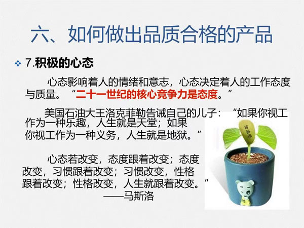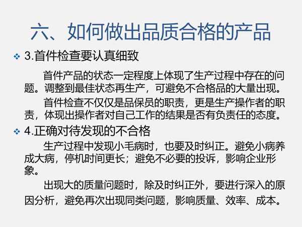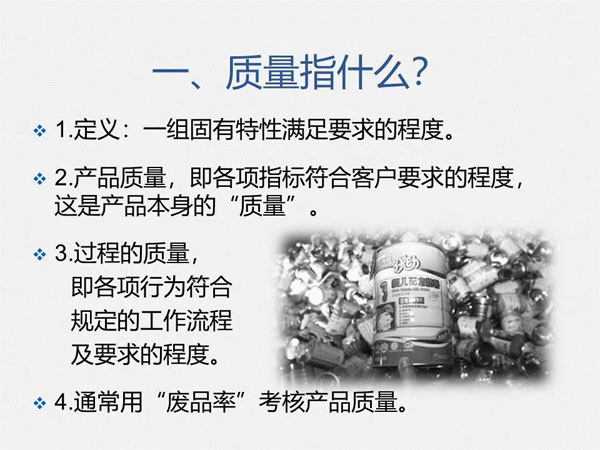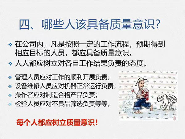 一個企業應該在全體職工中進行有針對性的質量意識教育,并且利用企業各種媒體—報紙、廣告和有限電視等舉辦質量宣傳,包括質量跟蹤、各類專題,使質量第一的思想深入人心。