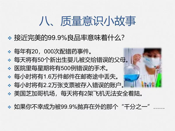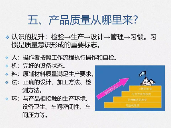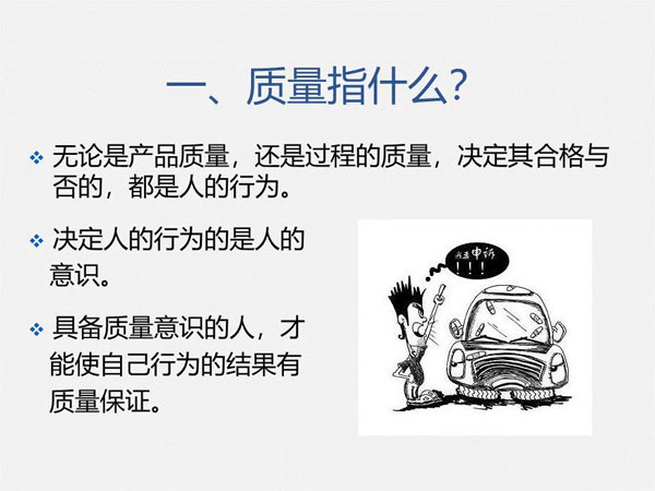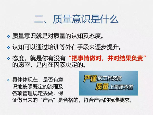 質量意識體現在每一位員工的崗位工作中,也集中體現在企業最高決策層的崗位工作中,是一種自覺地去保證企業所生產的交付顧客需求的產品—硬件、軟件和流程性材料質量、工作質量和服務質量的意志力。